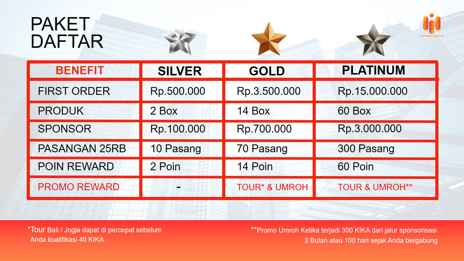 PT. Inti Megah Teknologi ( IMTECH ) Merupakan sebuah perusahaan perdagangan berbasis jaringan serta PLATFORM BUSINESS dengan berbasis Community yang sadar akan pentingnya sebuah investasi, memiliki sebuah system yang mampu memberikan KESEJAHTERAAN kepada para mitra-mitranya memberikan kepastian pendapatan dengan PENGAHARGAAN atas keberhasilan yang spektakuler.